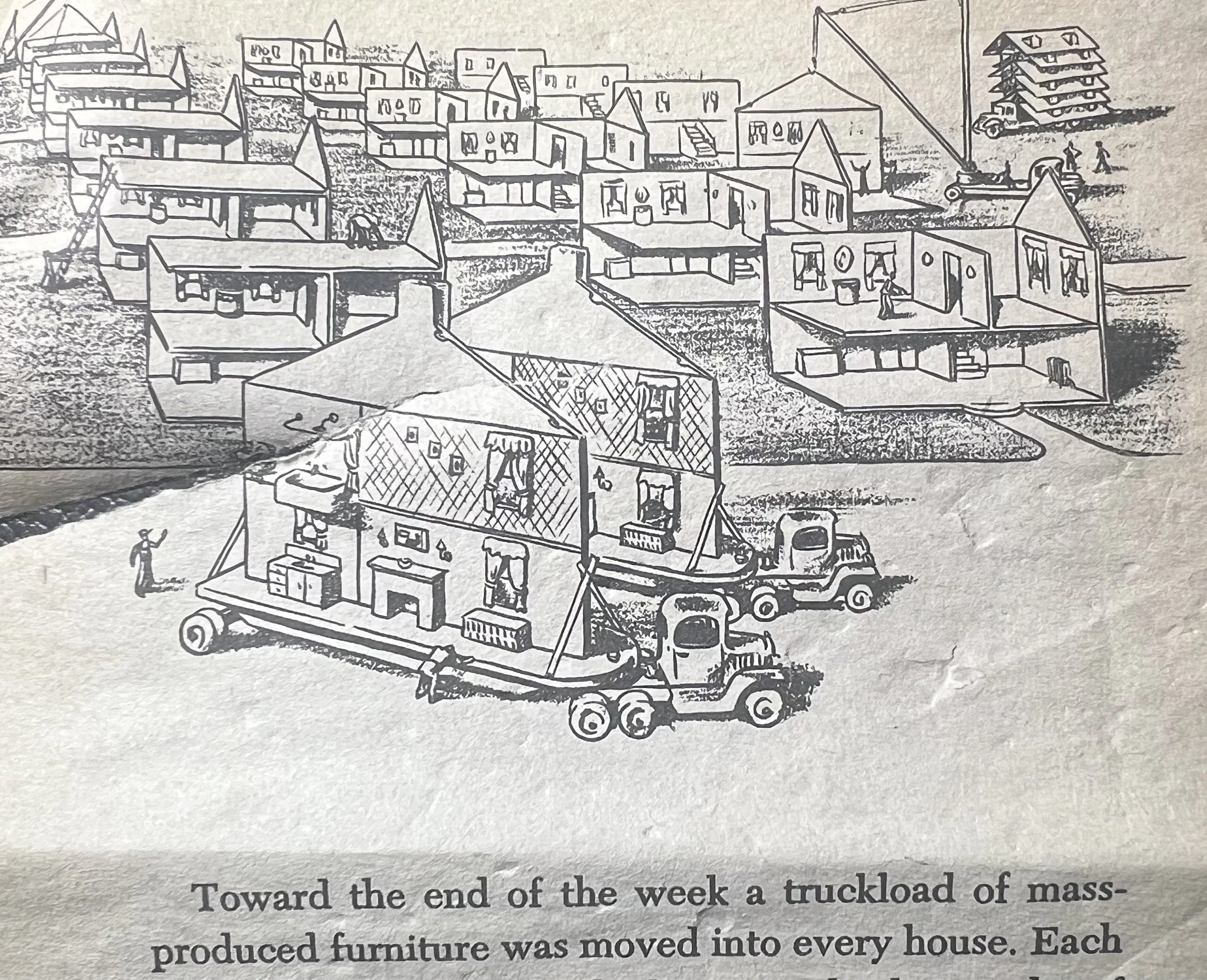 The illustration above landed at my feet as I was contemplating my next blog! It’s page 145 from a children’s book [Centerburg Tales by Robert McCloskey] Unfamiliar with architectural construction processes, has imagined in the illustration what prefabrication of homes might be in the 1940s. The reality is if prefabrication truly was cost efficient Builders would be building homes by this method. In truth, many components are mass-produced/pre-fabricated at reduced cost, but conventional framing is holding on as the most cost efficient method of assembly. Prefabricated homes are available and do offer more precise quality control, energy efficiency, and less site impact; but has yet to be price competitive. Systems furniture and Clean Room Labs are good examples of successful prefabrication of components in the construction process that are well established. Yet they still they require a high level of planning, management, staging and coordination. For further reading PRE FAB by Allison Arieff and Bryan Burkhart is a good resource to explore the many ways Prefabrication has been employed for homes and more. : https://www.amazon.com/Prefab-Allison-Arieff/dp/1586851322